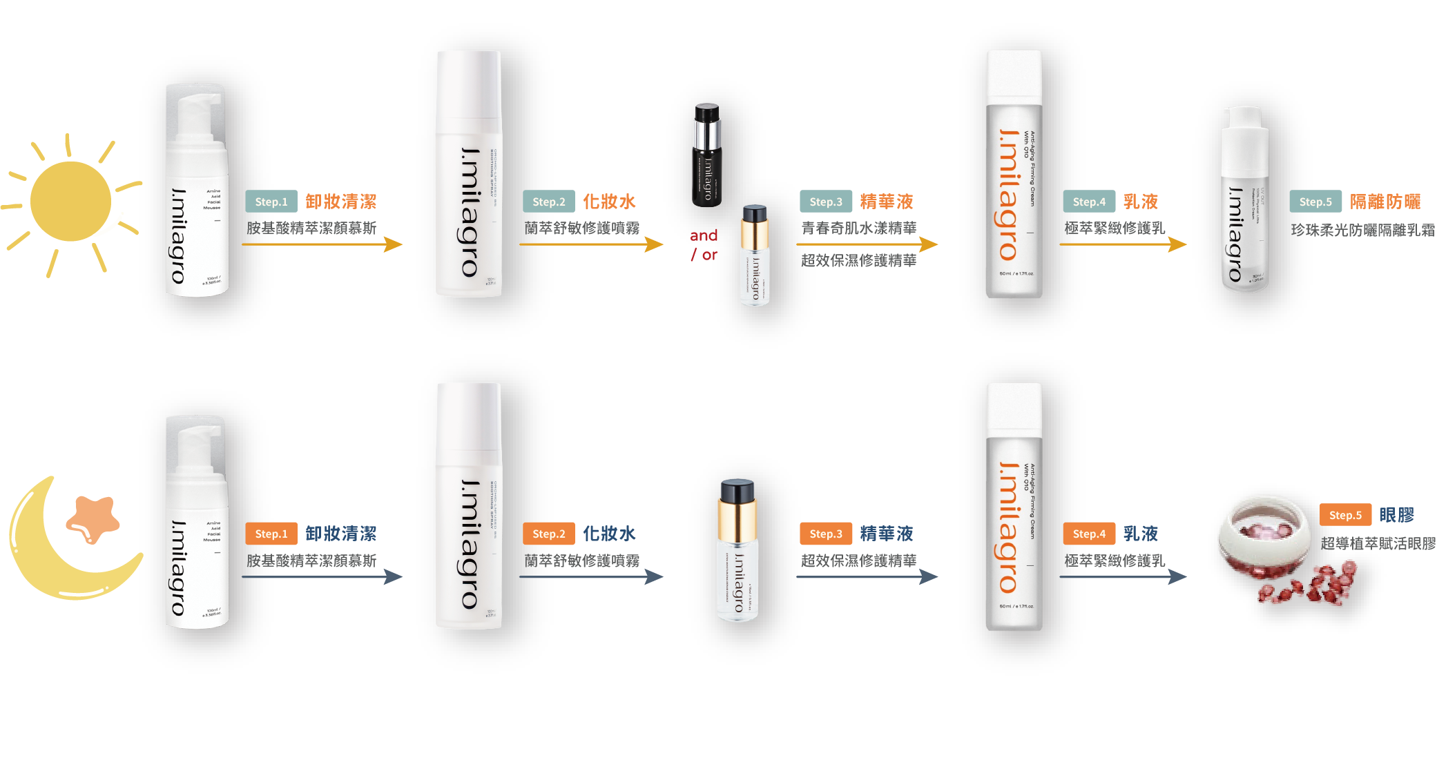 夜晚:皮膚累積了整天的刺激感到疲倦,對外在的抵抗力較差,需要讓皮膚得到適當的休息。這時就適合提供舒緩修復的產品,讓皮膚歸零更新。